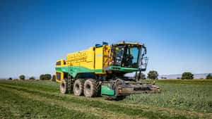 Der neue Oxbo Erbsendrescher GP6300 kommt mit einem 400 PS-Motor von Scania und einem 2,3 t Bunker. Auf der Straße ist die 26 t schwere Maschine mit 40 km/h unterwegs.